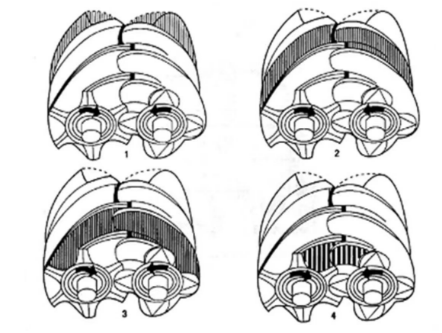 如下图所示,螺杆压缩机的工作循环可分为吸气、压缩和排气三个过程。随着转子旋转,每对相互啮合的齿相继完成相同的工作循环。被密封在齿间容积中的气体随齿移动所占据的体积也随之、成小导致压力升高,从而实现气体的压缩过程,当齿间容积与排气孔口连通后,即开始排气过程。